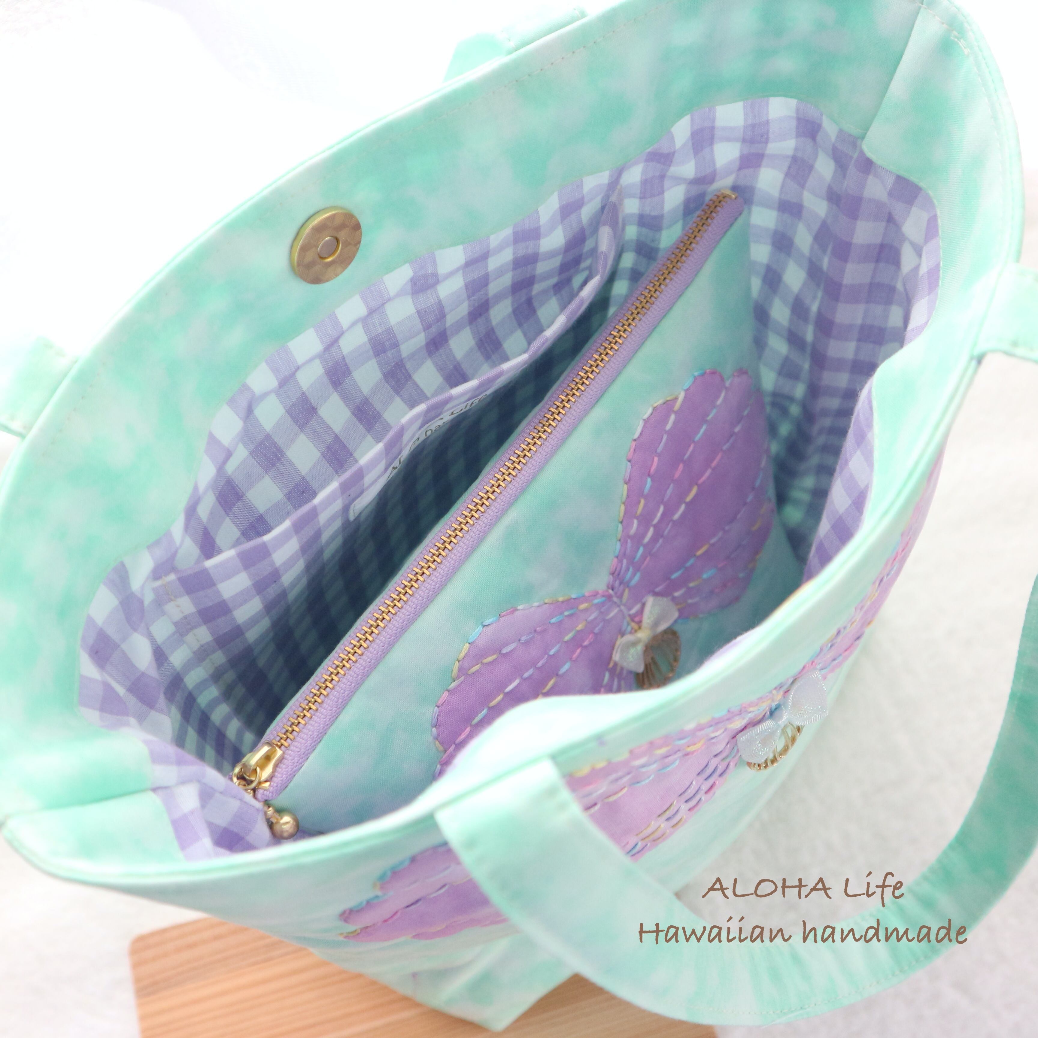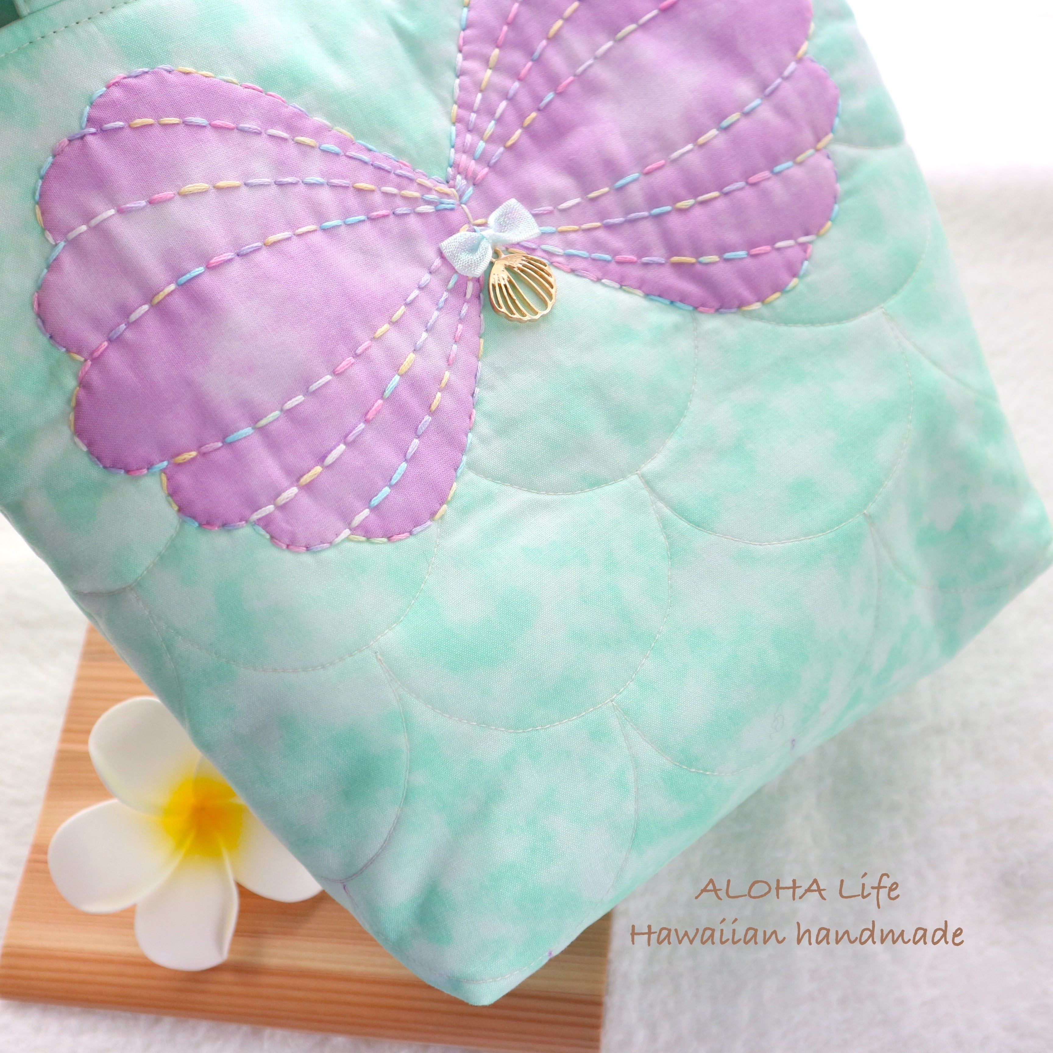 シェルのデザインは一針一針、手縫で丁寧にステッチをしてミシンでウロコ模様をステッチ