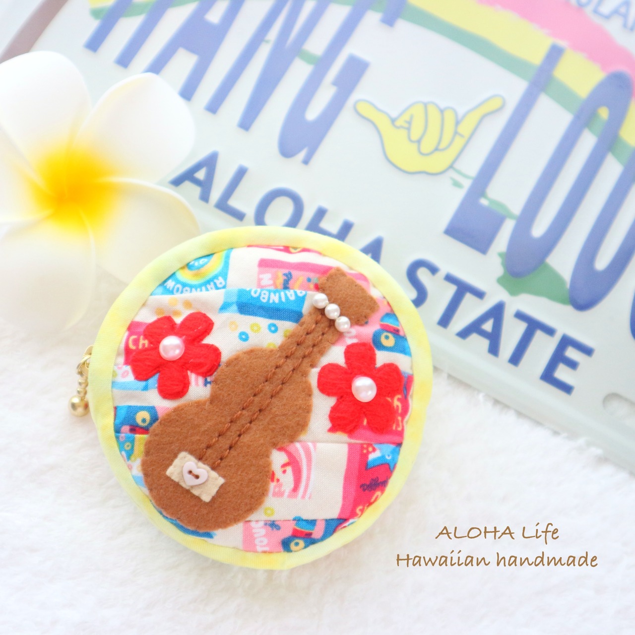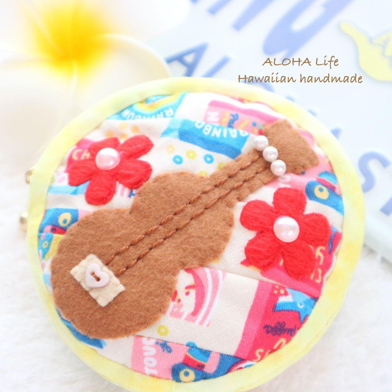 ウクレレはフェルト素材で、お花飾り、ビーズが付いてます
